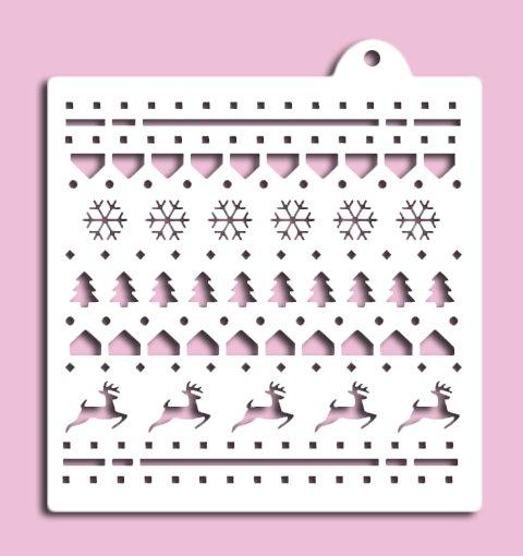 Our Christmas Sweater Pattern Cookie Stencil is made on a 5.5" x 5.5" template. This design features snowflakes, Christmas trees and reindeer. Perfect for decorating your festive winter and holiday cookies! This stencil also makes for a fun ugly sweater cookie!