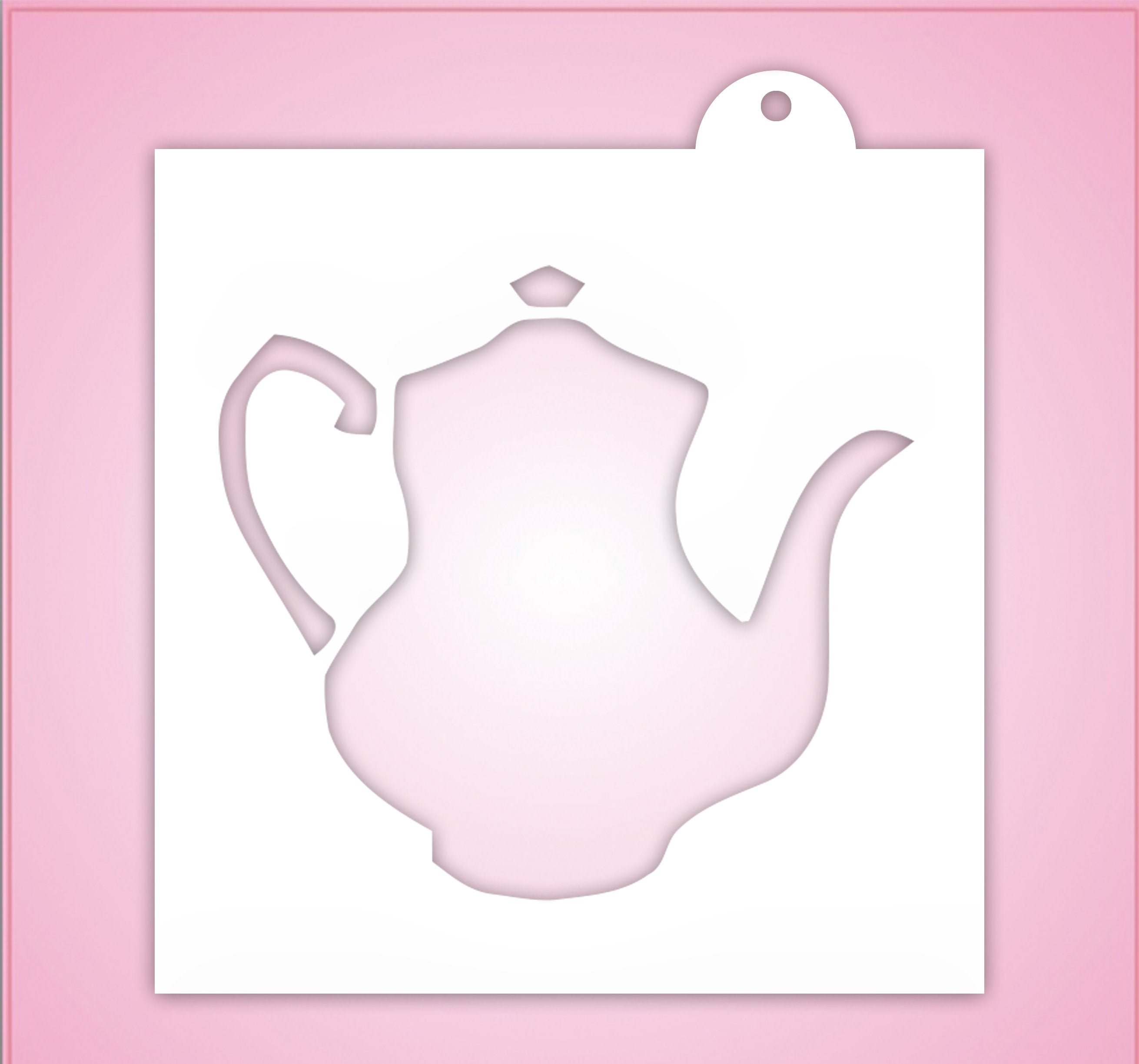 Our Teapot Cookie Stencil measures about 2.5 inches wide x 2.25 inches tall and is made on a 5.5 inch x 5.5 inch template. Use this cookie stencil for decorating cookies for a tea party, Mothers Day treats and more!
