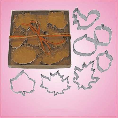 Prepare to fall for baking fun! The Autumn Cookie Cutter Set comes with seven tin-plated steel cutters that are 1 inch deep. You'll receive a 2-3/4-inch by 1-1/2-inch Acorn, a 2-1/2-inch by 2-1/4-inch Apple, a 3-1/2-inch by 3-inch Ivy Leaf, a 3-inch by 3-1/2-inch Maple Leaf, a 3-1/4-inch by 2-1/2-inch Oak Leaf, a 2-1/2-inch by 3-inch Pumpkin and a 2-3/4-inch by 3-3/4-inch Squirrel. Clean the cutters by hand and towel them dry after use. Add one to your collection today!