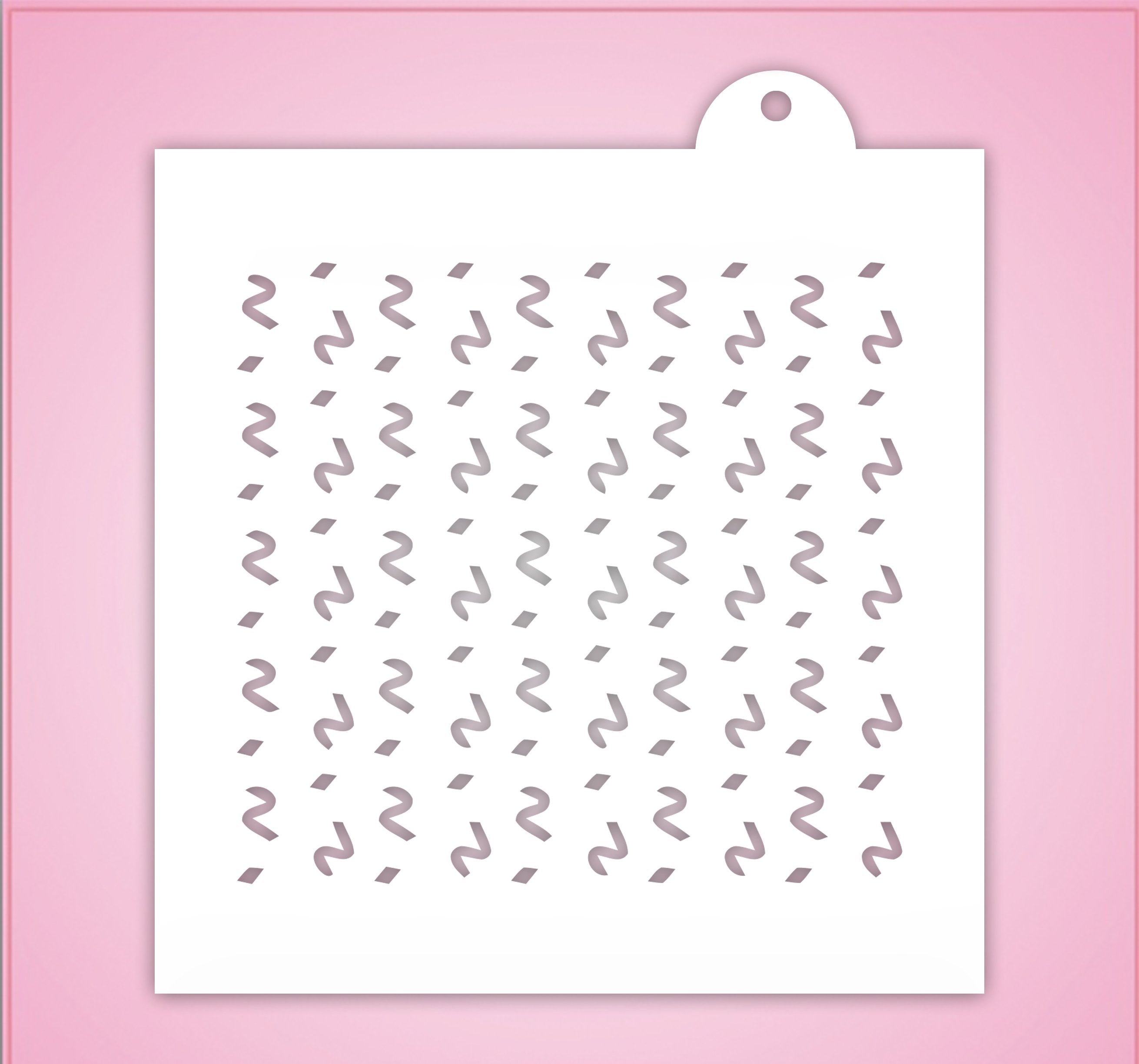 Bake up a celebration! Our Confetti and Streamers Pattern Cookie Stencil is made on a 5.5 inch x 5.5 inch template. This party design is perfect for everything from decorating birthday cookies to New Years Eve treats!